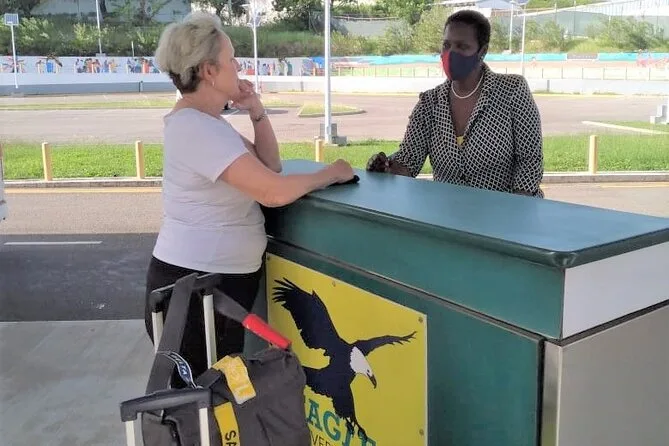 Your round-trip includes meet-and-greet at V.C. Bird International Airport by an Eagle Transfers representative (easy to spot with their navy blue and yellow logo), direct transport by air-conditioned vehicle with professional driver straight to your hotel (no stops at other properties), plus return pickup scheduled by email before departure—all with space for one suitcase and one carry-on each.