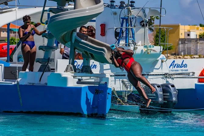 Your day includes two guided snorkeling stops at Antilla shipwreck and Boca Catalina reef with all gear provided, unlimited drinks from an open bar featuring cocktails or soft drinks, light lunch with wraps and tropical fruit served by a friendly local crew, plus access to playful extras like a rope swing and spinning water slide before sailing back along Aruba’s coast.