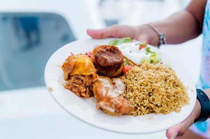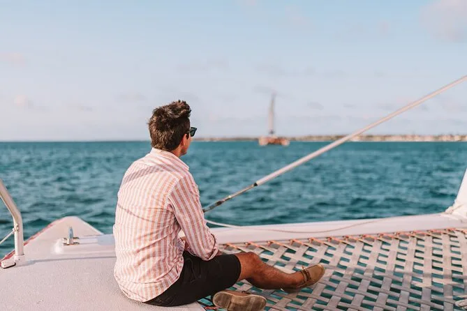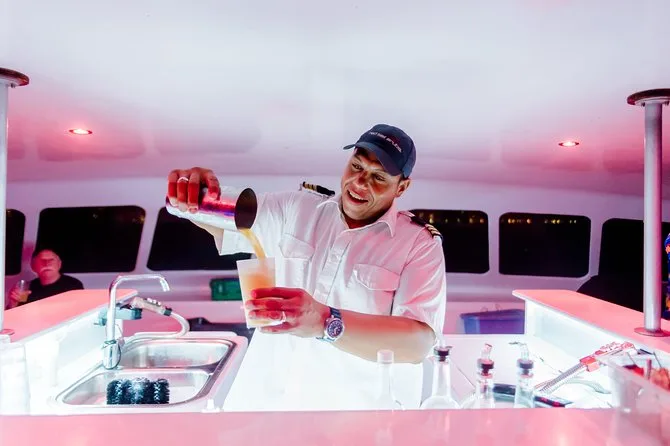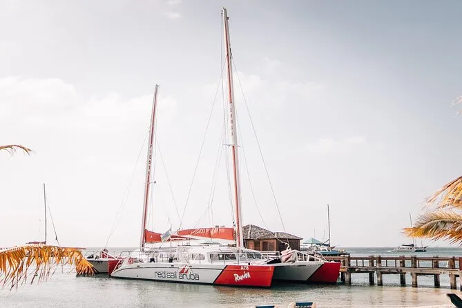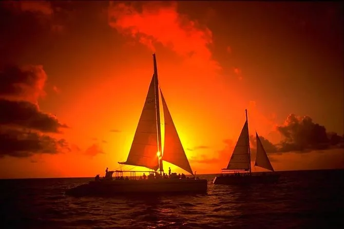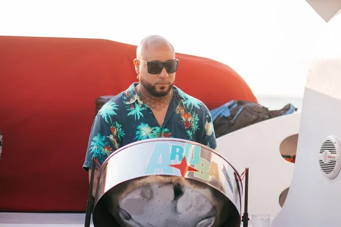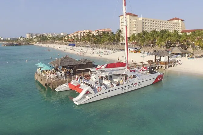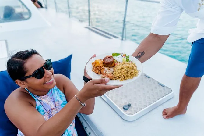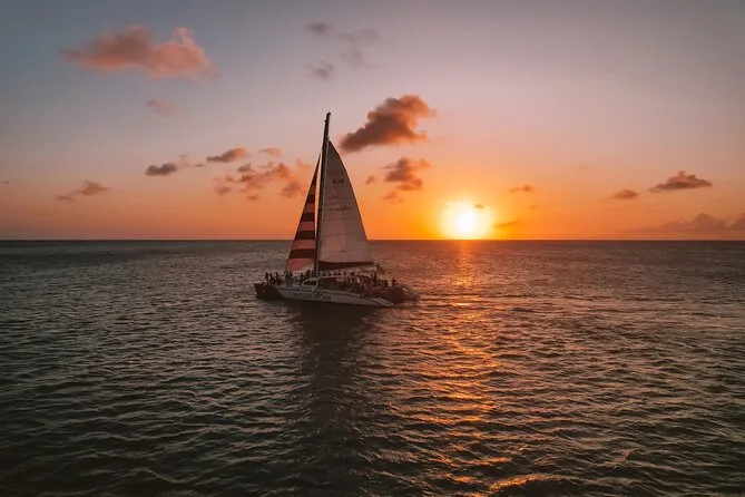 You’ll board a catamaran right off Palm Beach for a relaxed sunset sail along Aruba’s coast—with an open bar flowing, live Caribbean music playing softly in the background, and a buffet dinner of local favorites like keshi yena and fresh grouper. It’s easygoing and warm—the kind of evening where you’ll probably laugh more than you expected.