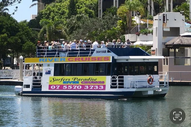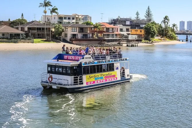 Your 1.5-hour day includes flexible departures from Surfers Paradise with engaging local commentary as you pass landmarks like Southport Yacht Club and Marina Mirage, plus morning tea or snacks depending on your selected time slot—afternoon cruises offer cheese and crackers while sunset trips add antipasto platters—and access to both indoor seating and an open sundeck alongside a fully licensed bar before returning to shore.
