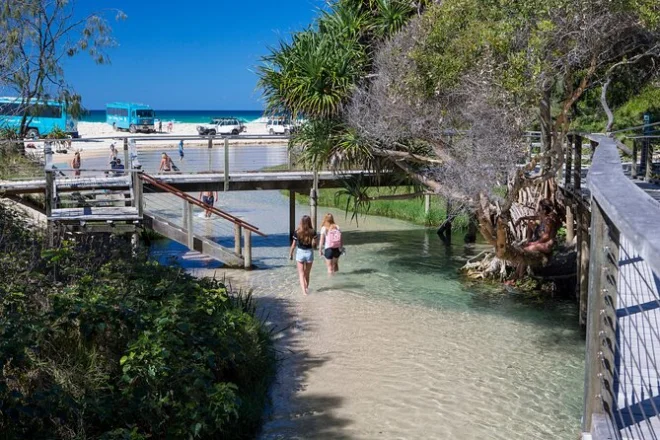 Someone handed me a mug of coffee before sunrise — I think it was Jess from the hotel staff — and next thing I knew, we were bouncing along in this big 4WD coach, engine humming, windows fogged with salt air. Our guide, Steve, had that Queensland way of talking where you’re never sure if he’s joking or not. He pointed out the ferry rolling in through a thin mist and said something about “K’gari time.” I didn’t know what that meant yet. By the time we hit the island, my shoes were full of sand and I’d stopped caring about them staying dry.
