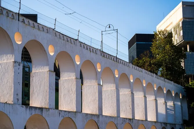 The tour covers Santa Teresa, Lapa (including Arcos da Lapa), Passeio Público park, Cinelândia square, and ends at Confeitaria Colombo.