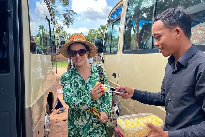 Your day includes early morning hotel pickup in Siem Reap city by air-conditioned minivan or bus; guided visits to Angkor Wat at sunrise plus Ta Prohm, Bayon, Baphuon and more; entry to all listed sites (except temple pass); a traditional breakfast at a family-run spot in Preah Dak village with vegetarian options; free bottled water and cool towels throughout; then drop-off back at your hotel after exploring Cambodia’s most iconic temples together.