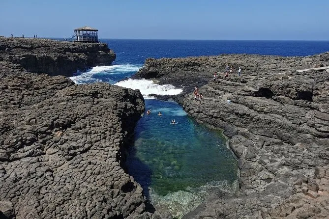 Palmeira came next — just a handful of fishing boats bobbing in the port and some locals chatting over coffee. Paulo waved to someone he knew (everyone seemed to know him), then led us through narrow streets that smelled faintly of grilled fish and sea air. At Buracona, we waited our turn to peer into the “Blue Eye.” It’s this natural pool inside volcanic rock — when the sun hits just right between 11 and 1:30, it glows this wild electric blue. I tried to take a photo but it never looks the same as in person. There was a salty breeze up there too.