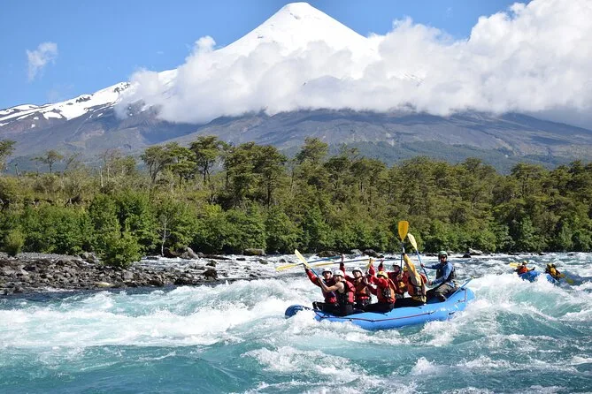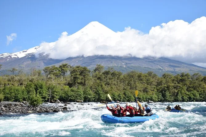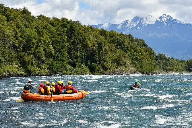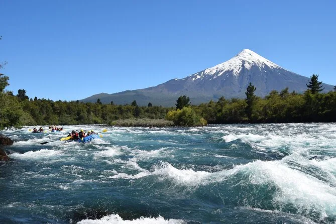Rafting Petrohué’s turquoise water with volcano peaks all around