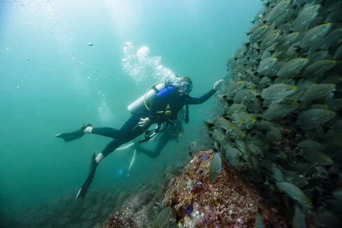 You’ll start your day diving off Flamingo with a local guide, exploring volcanic rock reefs around Catalina Islands & North Island. Expect encounters with tropical fish, rays or maybe even sharks as you descend up to 18 meters deep. Between dives, relax on deck with fresh fruit and cookies before heading back around noon — it’s those quiet surface moments that stay with you.