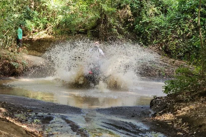Your day includes all necessary gear like helmet and goggles plus all entry fees and taxes; you’ll also enjoy a meal break at a local restaurant before heading back after four hours of exploring waterfalls, beaches, jungles, and villages with your guide.