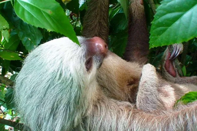 La Paz Waterfall was louder than I expected — you feel it more than hear it at first. There’s mist everywhere and the rocks are slick under your shoes. We didn’t stay long but I managed a few blurry photos. After that we hit a lookout where you can see San Fernando Waterfall and drink more coffee (yes, again). There were parrots overhead and someone handed around a local snack — not sure what it was called, kind of chewy, slightly sweet? Marco tried to teach me the name but I probably butchered it. We watched iguanas sunning themselves from a bridge at the next stop, then spotted two sloths curled up in a tree nearby. They look fake until they move — super slow, almost like they’re underwater.