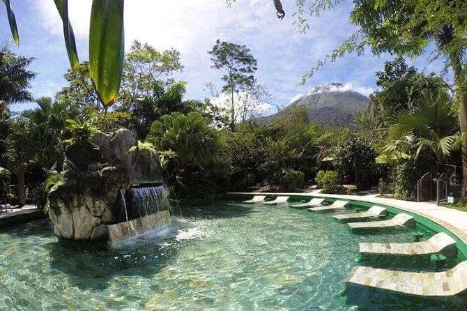 You will enjoy views of Arenal Volcano during lunch and while relaxing at its base in thermal pools.