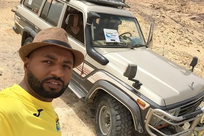 Nach dem Mittagessen ging es direkt in die Schwarze Wüste. Der Boden hier ist bedeckt mit dunklen Vulkansteinen – fast so, als hätte jemand überall Holzkohle verstreut. In El Haize (bei Einheimischen auch St. George Oasis genannt) gibt es eine natürliche heiße Quelle, in die man die Hände tauchen kann – das Wasser riecht leicht mineralisch und wärmt angenehm. Als nächstes stand der Kristallberg auf dem Programm – ein kurzer Stopp, um die im Sonnenlicht funkelnden Quarzkristalle zu bewundern. Über holprige Pfade rumpelten wir durch das Agabat-Tal; die Felsformationen hier sehen aus, als kämen sie von einem anderen Planeten.