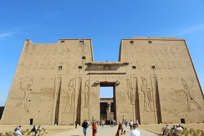 Der nächste Morgen begann früh mit Frühstück auf dem Deck, während wir die Heißluftballons über dem Westufer schweben sahen. Das Tal der Könige war innen kühler als erwartet – fast frisch im Vergleich zur Außentemperatur. Wir besichtigten drei Gräber; die Farben wirkten, als wären sie erst gestern gemalt, obwohl sie Tausende Jahre alt sind. Im Tempel der Hatschepsut erklärte unser Guide die Reliefs, die ihre Expedition nach Punt zeigen (davon hatte ich vorher noch nie gehört). Die Memnon-Kolosse standen still auf einem Feld – Vögel saßen auf ihren Köpfen – und Ahmed erzählte von ihrem geheimnisvollen „Singen“ bei Sonnenaufgang. Zurück an Bord setzten wir die Fahrt nach Edfu fort, während Fischer in kleinen Booten winkten.