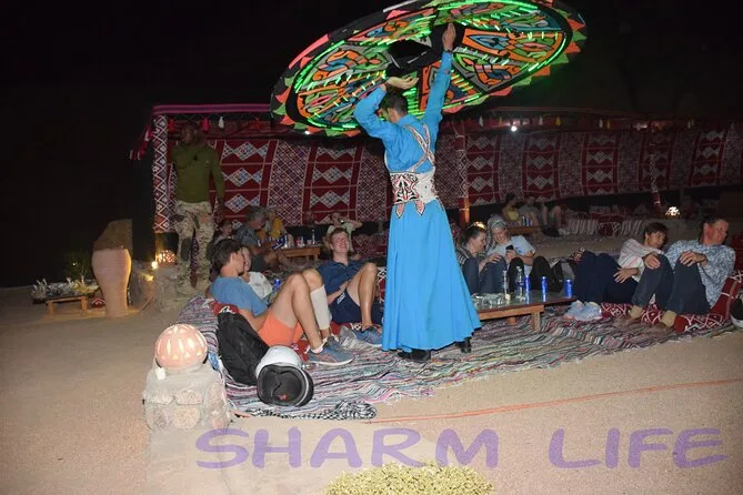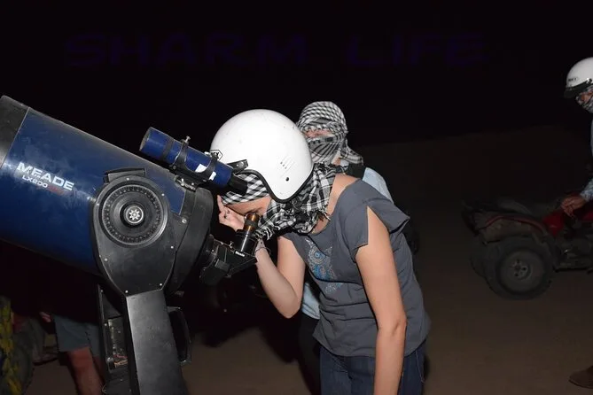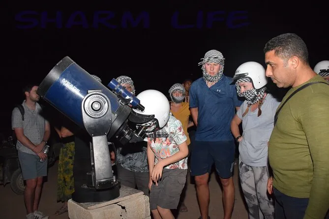 Dein Abend beinhaltet den Hoteltransfer in einem klimatisierten Fahrzeug von überall in Sharm El Sheikh oder nahegelegenen Unterkünften, die Nutzung neuer Quads (inkl. Helm), Kamelritte (auch mehrfach möglich), unbegrenzten Beduinen-Tee, Wasser und Softdrinks beim Abendessen, Zugang zu leistungsstarken Teleskopen für geführte Sternenbeobachtungen mit Astronomie-Experten, eine Live-Orient-Show beim Dinner mit vegetarischen und nicht-vegetarischen Buffetoptionen – und ja, es gibt unterwegs Toiletten, bevor es nachts zurück zum Hotel geht.