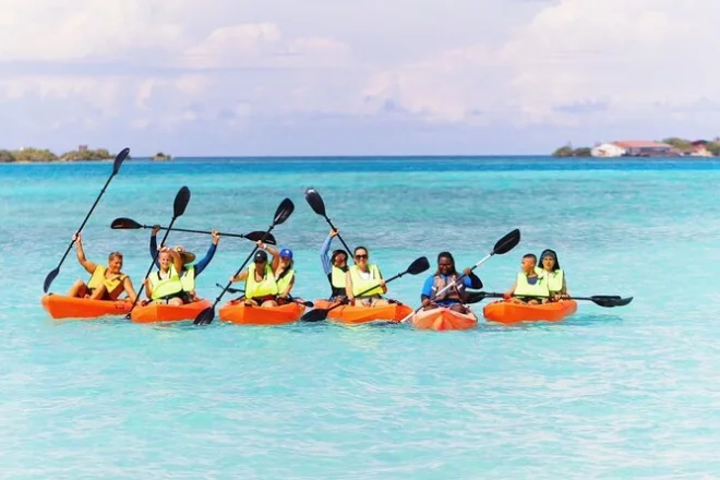 Erkunde mit einem lokalen Guide Arubas Spanish Lagoon per Kajak, gleite an Mangroven vorbei und schnorchle am farbenfrohen Barriereriff von Mangel Halto. Genieße danach ein entspanntes Mittagessen am Wasser. Freu dich auf Lachen, salzige Brisen und Momente, die lange im Herzen bleiben.