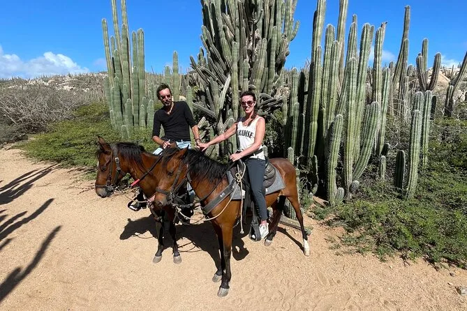 Bei Rancho Amistad sattelst du dein Pferd für einen entspannten Ausritt durch Arubas wilde Landschaft. Unterwegs entdeckst du Kakteen, bunte Vögel und flinke Eidechsen. Mit einem lokalen Guide reitest du zum Wariruri Beach und Little Natural Bridge, genießt salzige Meeresluft, Fotostopps und ruhige Momente zum Durchatmen.