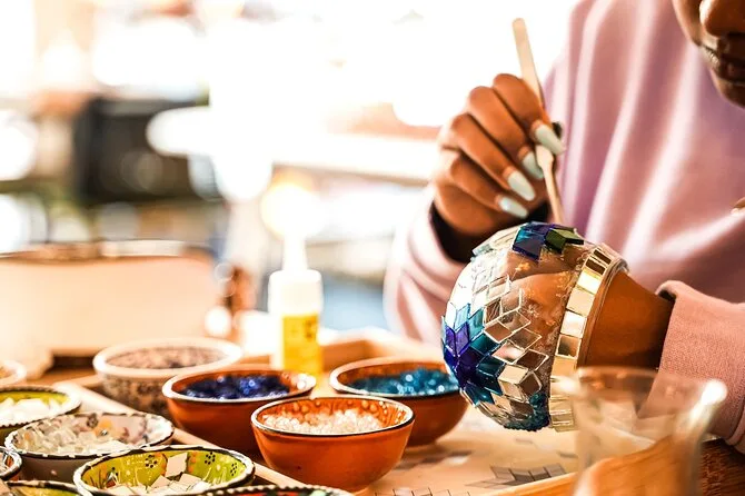 In deinem Erlebnis sind alle Materialien enthalten, die du brauchst, um deine eigene türkische Mosaiklampe in diesem praktischen Workshop in Brisbane Fortitude Valley zu gestalten. Während du arbeitest, genießt du Apfeltee und hausgemachte türkische Butterkekse – das Studio ist zudem komplett rollstuhlgerecht.