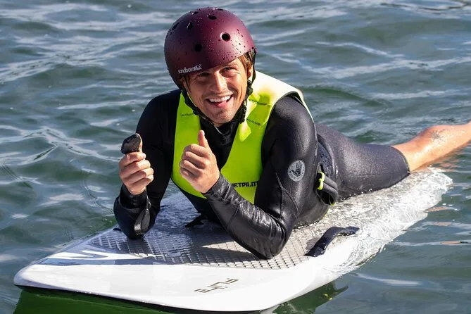 Deine Session beinhaltet die Nutzung eines motorisierten elektrischen Hydrofoil-Surfboards (Fliteboard) sowie Sicherheitsausrüstung wie Schwimmweste und Helm – alles wird vom Guide gestellt, du musst nur zum Fahren kommen.