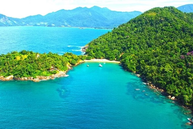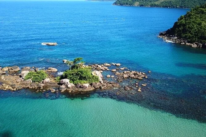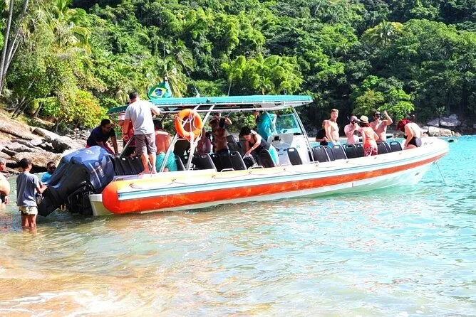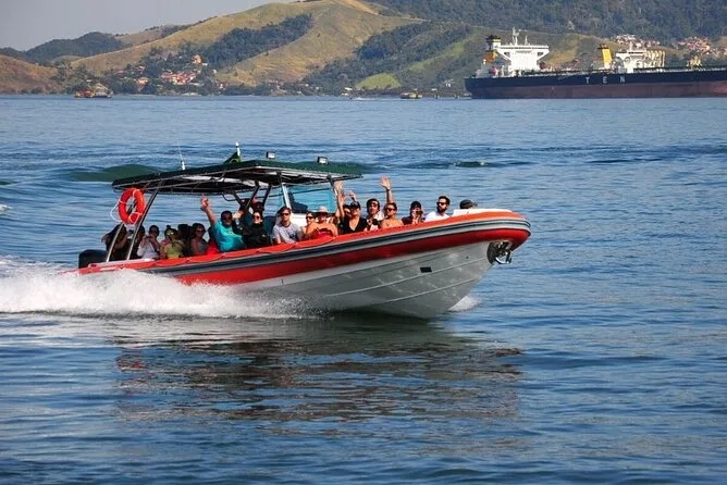 Mit dem Superboot saust du die Küste von Ilhabela entlang, machst Schnorchelpausen an Praia da Fome und Praia do Eustáquio und landest schließlich am Castelhanos Beach zum Mittagessen und Schwimmen. Genieße Stadtblick, salzige Brisen, Spaß mit deinem Guide und den wilden Atlantischen Regenwald – ein Tag, der lange nachwirkt, wenn die Haut wieder trocken ist.