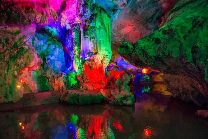 Mittags gab’s kantonesisches Essen in einem kleinen Lokal, das unser Guide ausgesucht hatte – nichts Aufwendiges, sondern ehrliche Gerichte mit viel Ingwer und Knoblauch. Danach fuhren wir zur Jinlong-Höhle. Die Höhle ist riesig; man fährt mit einem kleinen Boot über einen unterirdischen Fluss, während bunte Lichter die Felswände zum Leuchten bringen. Es ist kühl und feucht, und manchmal riecht man mineralische Erde. Herr Chen zeigte uns Felsformationen, die wie Drachen und Schildkröten aussehen (die Schildkröte habe ich erkannt, beim Drachen bin ich mir nicht sicher). Wir schlenderten durch enge Gänge, wo man den Kopf einziehen muss – er scherzte, dass Touristen dort immer an den „Weisheitsstein“ stoßen.