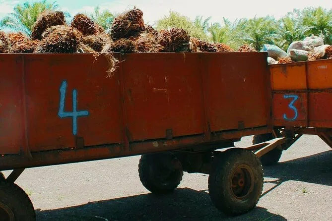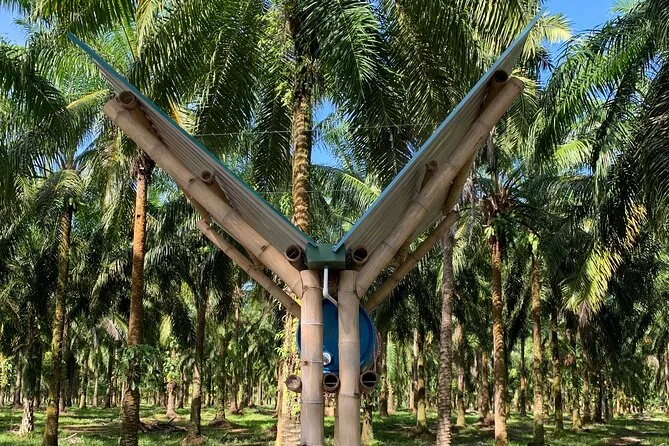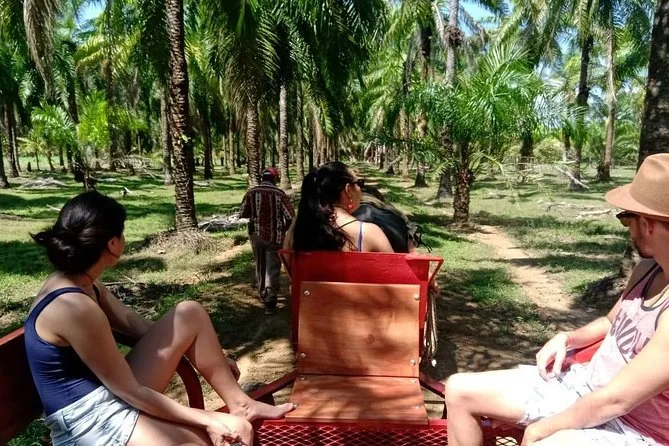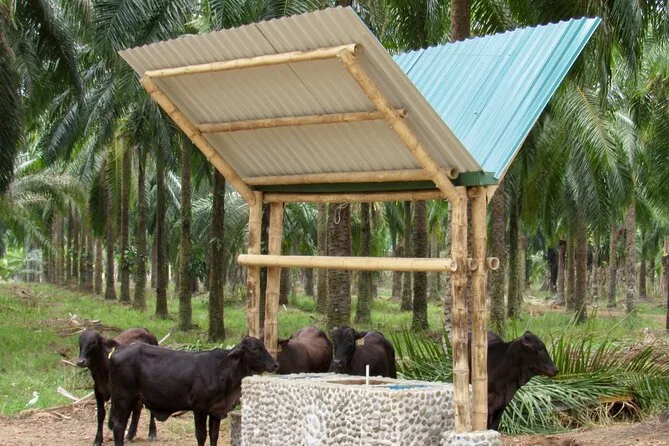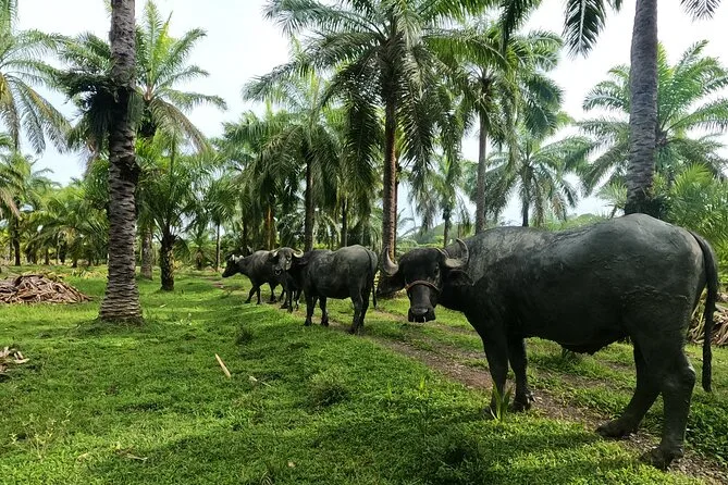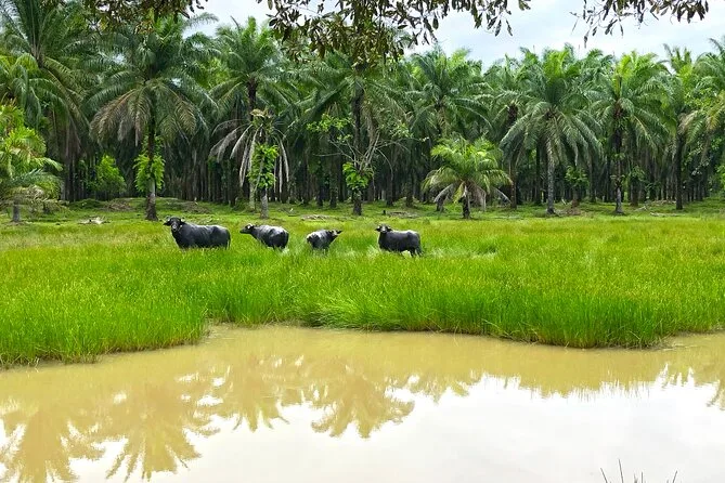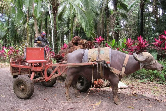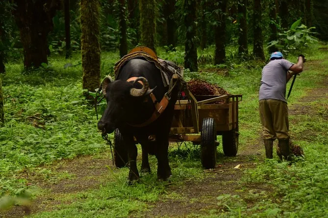 Kaum angekommen, fiel mir sofort der erdige Duft auf – feuchtes Gras vermischt mit der süßen Note der Obstbäume. Unser Guide Luis winkte uns zu einem schattigen Wagen, vor dem zwei mächtige Wasserbüffel entspannt mit den Schwänzen wedelten. Er erzählte, wie diese sanften Riesen die Palmölernte über die 65 Hektar großen Bambushaine ziehen. Die Fahrt war holprig, aber langsam genug, um alles in Ruhe aufzunehmen: endlose Palmenreihen, Hühner, die flink dazwischen huschten, und ab und zu ein Ziegenbock, der in der Ferne rief.