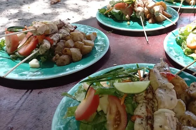 Das Anlegen an Playa Fantasia war fast ein bisschen komisch – als würde man irgendwo eindringen, wo man nicht willkommen ist. Der Sand knirschte unter meinen Füßen (ich wusste gar nicht, dass Sand das kann), und zwischen den Bäumen hingen Hängematten, halb vom Dschungel versteckt. Unsere Guide Li zeigte auf ein paar Affen über uns; ich versuchte, ein Foto zu machen, bekam aber meist nur verschwommene Schwänze. Das Mittagessen gab’s direkt am Strand: Hähnchen- und Steakspieße, geröstete Kartoffeln, Salat – alles frisch, nichts Aufwendiges, aber genau das, was man nach dem Schwimmen braucht. Der Koch bot mir einen zweiten Mojito an und zwinkerte, als ich „gracias“ falsch aussprach – wahrscheinlich hatte ich’s verdient.