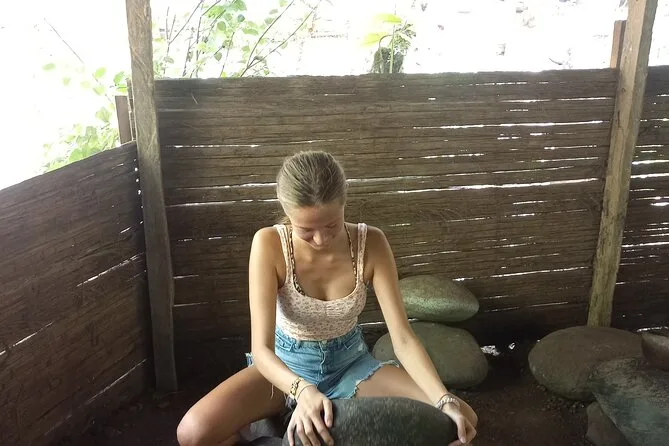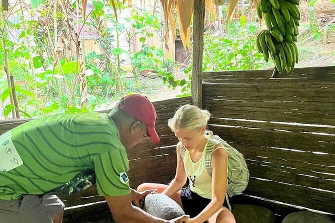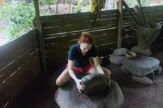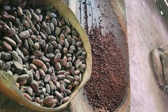 Du probierst Kakaofrüchte und hilfst, die Schokolade nach traditioneller Art zu mahlen.