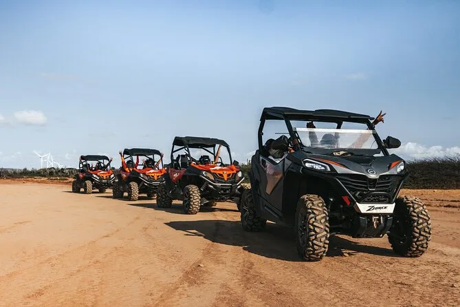 Dein Tag umfasst die Abholung von den meisten Hotels auf Curaçao, die Nutzung eines UTV-Buggys (für 2 Personen), UV-Schutzbrillen und Bandanas gegen den Staub, Wasserflaschen und Müsliriegel als Snack, sowie die Begleitung durch einen lizenzierten lokalen Guide – inklusive Zeit zum Schwimmen am DaaiBooi Strand vor der Rückfahrt.
