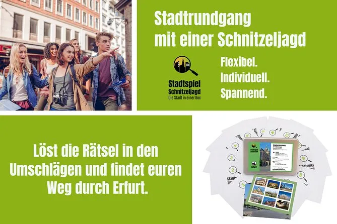 Dein Tag beinhaltet eine per Post zugeschickte Schnitzeljagd-Box mit nummerierten Umschlägen voller Rätsel, Wegbeschreibungen zu den Stationen im Erfurter Zentrum und spannenden Infos zu jeder Sehenswürdigkeit – dazu volle Freiheit, jederzeit Pausen einzulegen oder Umwege zu machen.