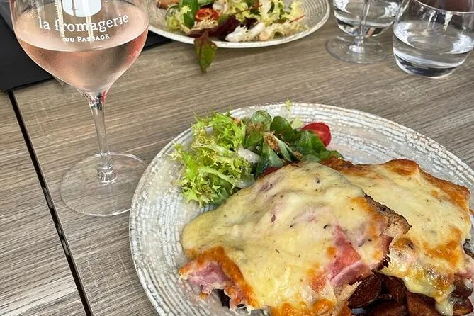 Die nächste Station war ein Croque Monsieur – ehrlich gesagt dachte ich, ich wüsste, was mich erwartet, doch dann entdeckte ich wieder Trüffel darin, und der heiße Käse quoll heraus. Gar nicht subtil, aber einfach köstlich. An unserem Tisch saß ein älteres Paar, das nach jedem Bissen „c’est magnifique“ sagte – ich musste lachen, denn ich schaffe kaum ein „merci“ ohne Stolpern. Die ganze Atmosphäre war entspannt, keiner schaute auf die Uhr oder drängte uns.