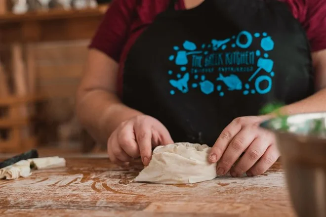 Die Greek Kitchen liegt zwei Stockwerke hoch, die Treppe knarrte leicht unter unseren Schritten. Drinnen fühlte es sich an wie in einer gemütlichen Privatküche – bunte Tassen, handgeschriebene Notizen am Kühlschrank, leise Musik im Hintergrund. Wir waren fünf Teilnehmer plus zwei Köchinnen; Li lachte, als ich versuchte, meine erste Dolma zu rollen („Enger!“ sagte sie). Wir schnitten Gurken für Tzatziki, überall roch es nach Knoblauch (meine Hände rochen noch Stunden später danach), und wir probierten Olivenöl, das so grün war, dass es fast leuchtete. Die Füllung für die Spanakopita sah einfach aus, aber das Ergebnis war perfekt – knusprig und warm, der Feta schön würzig zum Spinat.