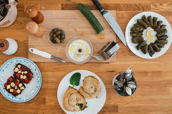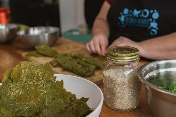 Dein Tag startet mit einem 30-minütigen geführten Rundgang über den Athener Zentralmarkt mit einer lokalen Köchin. Danach geht’s hoch in eine gemütliche Küche zum gemeinsamen Kochen. Brot und Oliven gibt’s bei jedem Kurs, dazu saisonale Snacks vom Markt, alle Rezepte (wie Tzatziki und Spanakopita) werden zusammen zubereitet. Zum Mittagessen gibt’s 250 ml lokalen Wein pro Person, Wasser steht den ganzen Tag bereit, und zum Schluss bekommst du die Rezepte zum Mitnehmen.