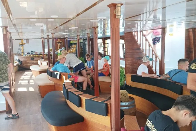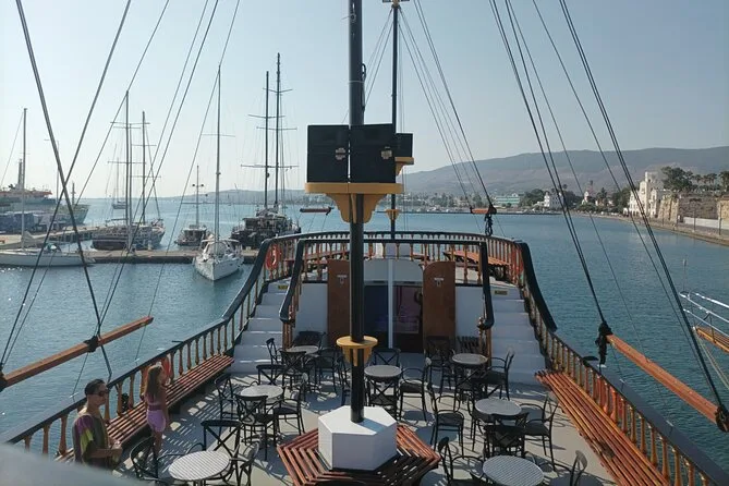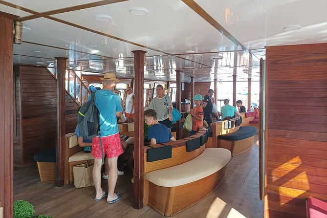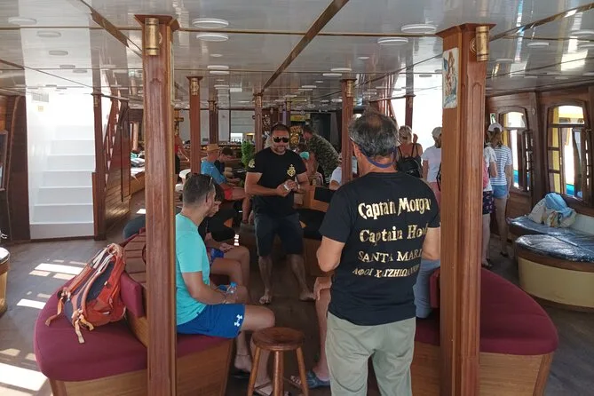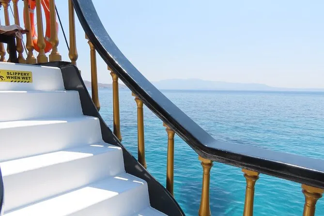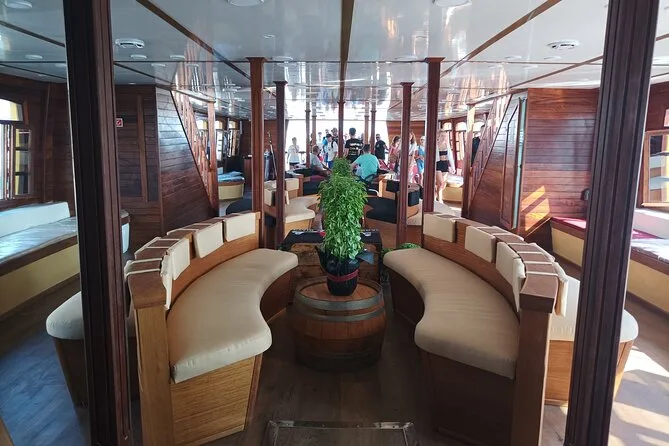Kurz nach dem morgendlichen Trubel stiegen wir im Hafen von Kos auf die Captain Morgan. Schon beim Einsteigen lag die Mischung aus Sonnencreme und Meer in der Luft. Das Schiff war größer als gedacht – drei Decks, alles nagelneu und blitzblank, mit dicken blauen Polstern, auf denen man am liebsten sofort zusammenklappen würde. Unser Guide Yannis begrüßte uns mit einem breiten Grinsen und einem Spruch über die „griechische Zeit“ (er hatte recht – wir legten zehn Minuten später ab). Familien, Paare, ein paar Alleinreisende wie ich – alle entspannten sich sofort, als wir den Hafen verließen.