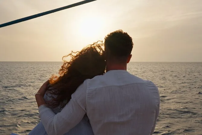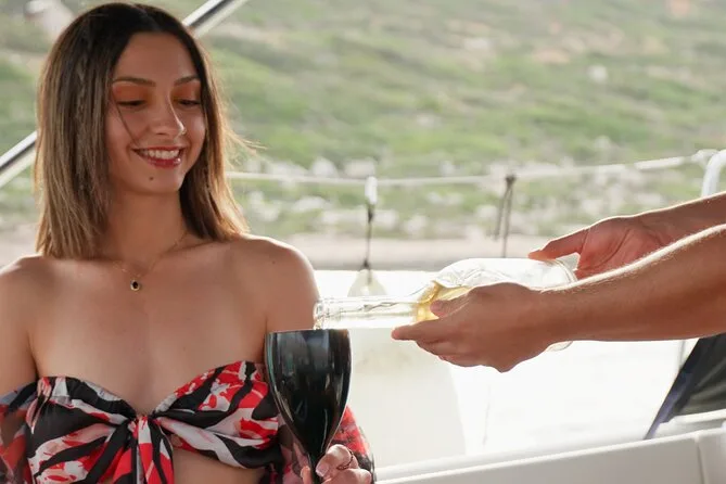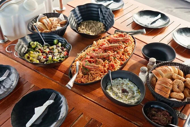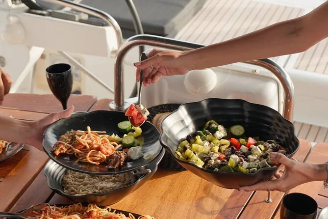 Dein Tag beinhaltet die Segelfahrt vom alten Hafen Heraklions mit allen Gebühren, Nutzung von Schnorchel- und Angel-Ausrüstung (einfach fragen), Paddleboards bei ruhiger See, ein komplettes Mittagessen mit Garnelen-Linguini oder vegetarischen Optionen, griechischem Salat und kretischen Vorspeisen, reichlich Wein oder Bier, frischen Obstsalat nach dem Schwimmen oder Sonnenbaden an Deck – und natürlich Toiletten an Bord, bevor es am Nachmittag zurückgeht.