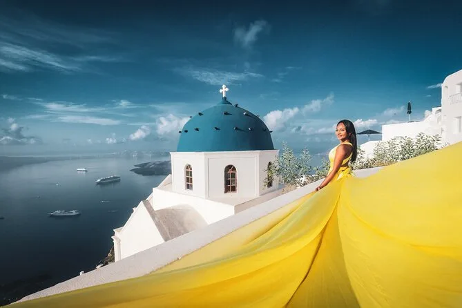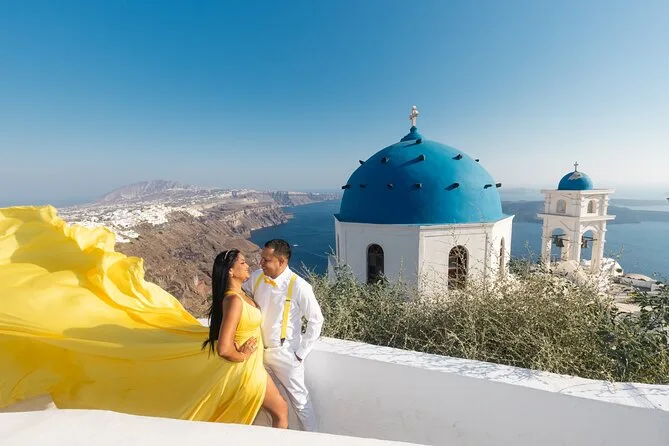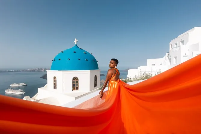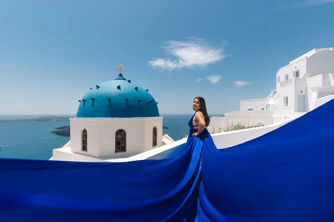 Santorini flying dress shooting imerovigli blaue kuppeln privater transfer