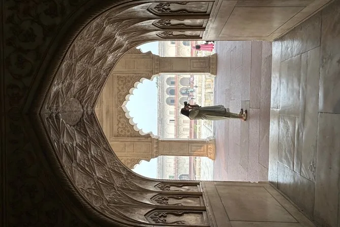 Das Frühstück gab es als kleines Buffet in einem nahegelegenen Hotel – nichts Besonderes, aber nach all dem Laufen (und den Emotionen) schmeckten heißer Chai und Paratha wie eine Belohnung. Ob es der Hunger war oder nicht – selbst die Marmelade schmeckte intensiver als sonst. Danach ging es zum Agra Fort. Die Mauern leuchten in einem tiefen Rot, das im Morgenlicht fast ins Violette spielt. Drinnen erwartet dich ein Labyrinth aus Palästen und Innenhöfen; Priya zeigte uns Details, die ich sonst übersehen hätte – verblasste Schnitzereien, alte Kanonenkugelschäden. Sie musste lachen, als ich versuchte, „Diwan-i-Khas“ auszusprechen (ich habe es definitiv verhauen). Familien picknickten unter Bäumen, und Schulkinder übten englische Begrüßungen an uns.