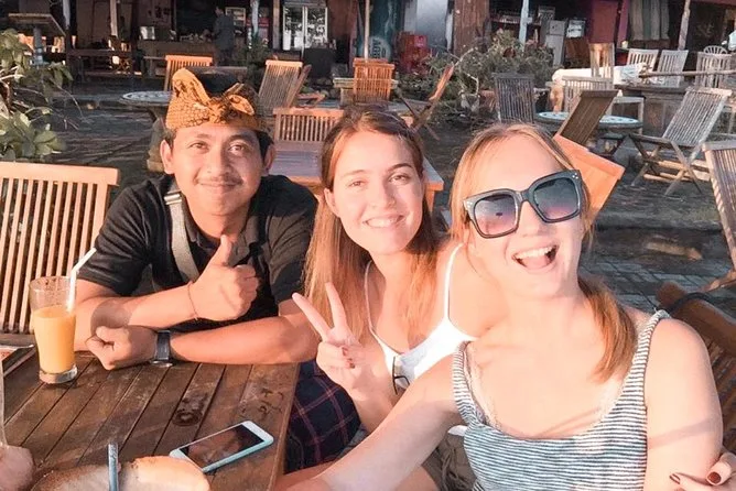 Mit dem Mittagessen hatte ich nicht gerechnet, aber nach dem Schwimmen war ich richtig hungrig. Es gab Nasi Goreng mit knusprigen Crackern und süßen Tee mit einem Hauch von Jasmin. Neben uns war eine Familie, deren Kinder immer wieder mit Muscheln zurückkamen, die sie gefunden hatten; ihr Lachen hallte irgendwie zwischen den Felsen wider. Wenn du den Wasserfall als Zusatz buchst (wir haben es gemacht), bringt dich Ketut über kurvige Straßen zum Kanto Lampo – kalter Sprühnebel im Gesicht, glitschige Steine unter den Füßen und das tiefe Rauschen des Wassers, das alle irgendwie leiser sprechen ließ.