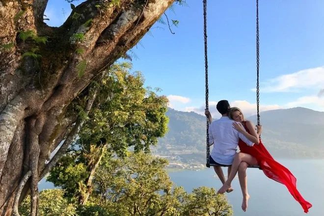 Danach ging es zum Wanagiri Hidden Hill. Dort gibt es diese originellen Schaukeln und Vogelnester, die auf die Seen Buyan und Tamblingan blicken. Ein lokaler Verkäufer bot frisches Kokoswasser an; wir gönnten uns eins, während wir darauf warteten, dass die Wolken über den Hügeln aufklaren. Die Aussicht ist weitläufig – wenn man eine der Plattformen erklimmt, sieht man beide Seen (Achtung, nach Regen wird es rutschig).
