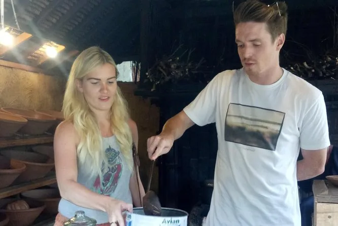 Nachdem wir sechs oder sieben Tees probiert hatten (der Ingwertee kitzelt noch immer in meiner Nase), folgten wir Wayan einen schmalen Pfad durch die Bäume. Plötzlich öffnete sich der Weg zu leuchtend grünen Reisfeldern, das Wasser schimmerte überall. Mitten darin stand eine kleine Bar, wo Einheimische saßen, lachten und plauderten. Ein Bauer namens Pak Made winkte uns zu; er war schon halb auf einer Kokospalme, bevor ich „Hallo“ sagen konnte. Ihm zuzusehen, wie er den Saft für den balinesischen Kokoswein anzapfte, wirkte viel schwieriger, als er es aussehen ließ. Er schenkte uns jedem ein Glas ein – trüb, kalt, mit einer angenehm süß-säuerlichen Note. Li lachte, als ich versuchte, „tuak“ auf Bahasa Indonesia auszusprechen – ich habe es wohl ziemlich verhauen.