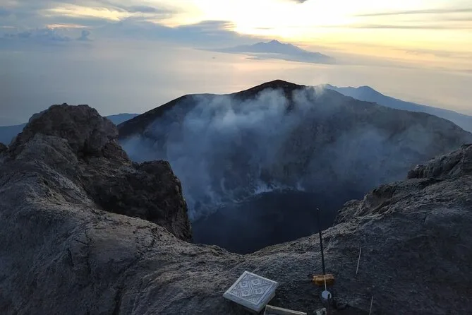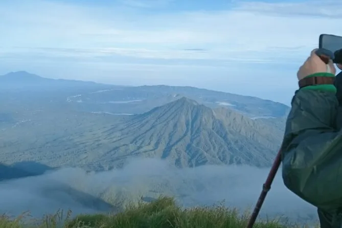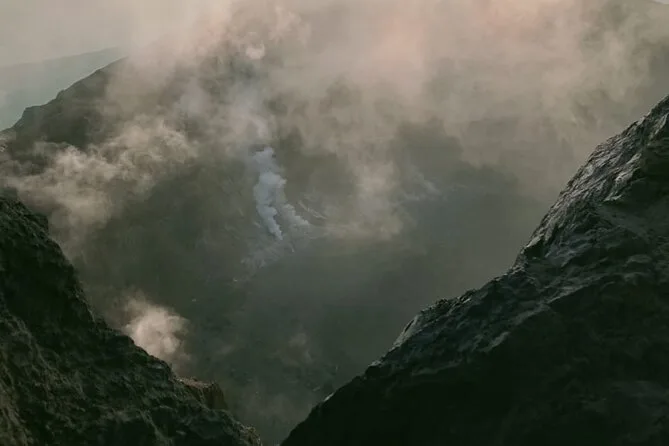 Um 5:30 Uhr waren wir über den Wolken. Der Himmel färbte sich in zartes Orange und Rosa – fast unwirklich. Bei genauem Hinsehen konnte man bis nach Lombok blicken. Für einen Moment herrschte Ruhe, alle genossen den Moment (und holten Luft). Pak Made machte Fotos, während wir heißen Kaffee aus seiner Thermoskanne tranken – besser schmeckte er nirgendwo.