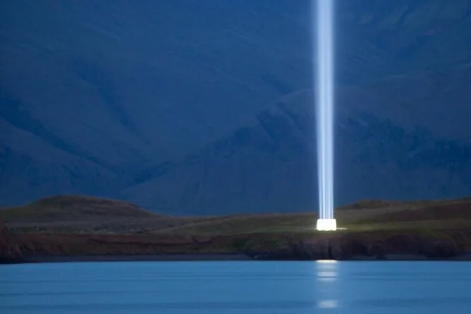 Der Weg zum Imagine Peace Tower war langsamer als gedacht. Nicht, weil es weit wäre (vielleicht 10 Minuten?), sondern weil alle immer wieder stehenblieben. Sigrún zeigte uns alte Steinhaufen und erzählte von Mönchen, die hier vor langer Zeit lebten – sie lachte und meinte, dass Isländer auf solchen Inseln immer über Geister sprechen. Der Wind wurde stärker, je näher wir dem Turm kamen, und meine Wangen wurden ganz kalt. Und plötzlich stand er da: eine Lichtsäule, die direkt in den Himmel schoss. Fast unwirklich im Dunkel, als hätte jemand ein Loch in die Wolken gestochen.
