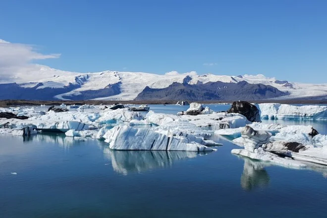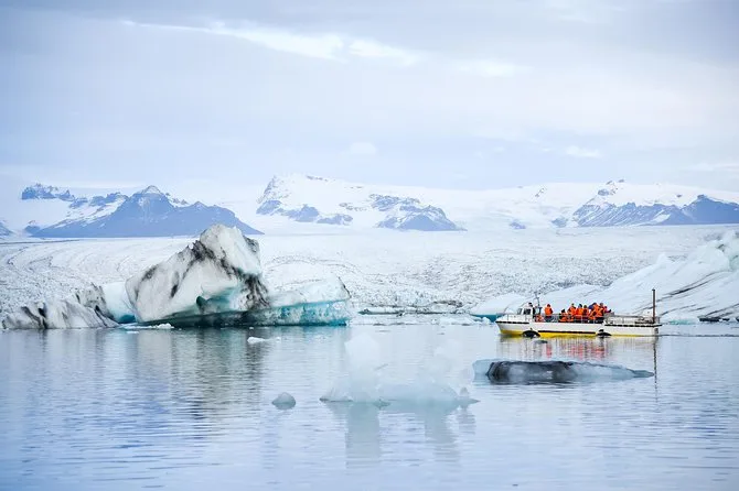 Deine Reise umfasst Abholung und Rückfahrt in Reykjavik, eine Übernachtung mit Frühstück an der Südküste, kostenloses WLAN und USB-Ladeanschlüsse im Bus, eine geführte Wanderung auf dem Sólheimajökull mit kompletter Sicherheitsausrüstung (Steigeisen, Eisaxt), eine Amphibienboot-Tour zwischen den Eisbergen von Jökulsárlón – und viele spannende Geschichten von unterwegs.