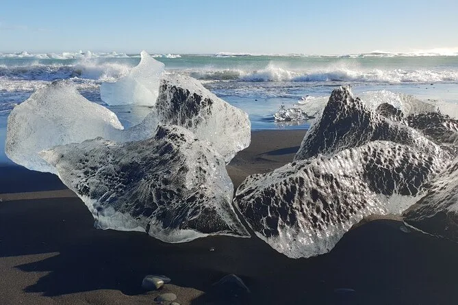 Der nächste Tag begann entspannt im Dorf Vík – nur Kaffee und ein paar verschlafene Schafe am Ortsrand. Doch dann ging es zur Gletscherlagune Jökulsárlón für die Bootstour, die fast unwirklich war. Eisberge in allen Formen trieben vorbei, manche leuchteten unter dem bewölkten Himmel in einem tiefen Blau. Ab und zu tauchten Robben auf (eine starrte mich sogar an, bevor sie abtauchte). Die Luft roch kalt – fast metallisch? Danach spazierten wir zum Diamond Beach, wo Eisstücke wie zerbrochene Kristalllüster auf dem schwarzen Sand verstreut lagen. Ich hob ein Stück auf; es schmolz schnell in meiner Hand.