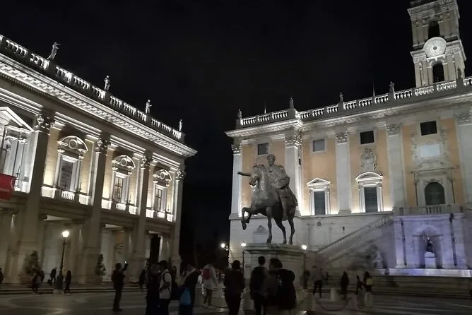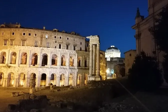 Als Nächstes erreichten wir die Piazza Venezia, wo das Vittoriano-Monument im Schein der untergehenden Sonne leuchtete. Es ist riesig – fast zu groß, um es auf einmal zu erfassen. Kurz hielten wir an der Piazza del Campidoglio inne; Michelangelos Gestaltung kommt besonders zur Geltung, wenn man direkt dort steht und auf das Forum Romanum blickt, während die Lichter der Stadt langsam angehen. Das Theater des Marcellus war ruhiger als erwartet, nur ein paar Einheimische mit ihren Hunden unterwegs, und in der Ferne hörte man das leise Summen von Rollern.