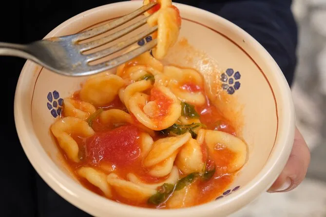 Radle mit einem lokalen Guide durch Baris lebendige Altstadt, entdecke historische Orte wie das Schwabenschloss und die Basilika San Nicola, und lerne in einer echten Familienküche, Orecchiette zu machen. Genieße deine selbstgemachte Pasta zum Mittagessen mit Wein – ein Erlebnis, das sich mehr nach Besuch bei Freunden anfühlt als nach einer Tour.