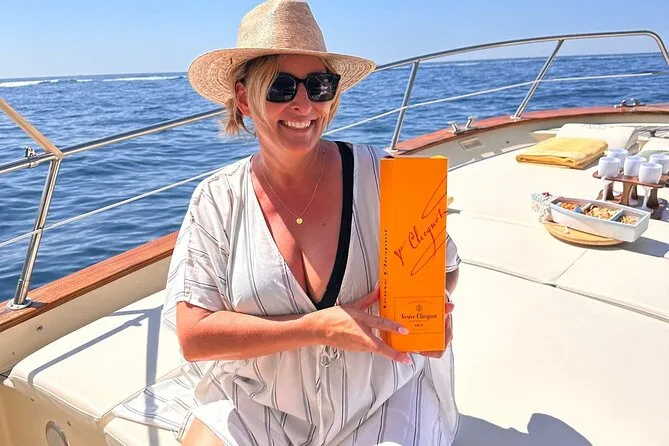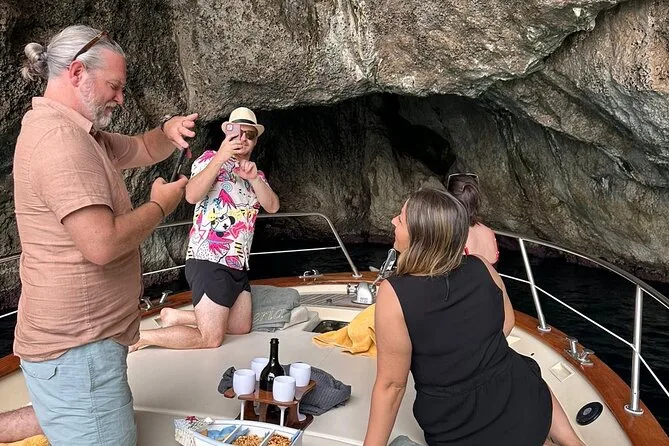 Dein Tag startet mit der Abholung nahe der Marina von Sorrent, bevor du an Bord deines privaten 8-Meter-Gozzos mit lokalem Skipper gehst; alle Getränke (Wasser, Aranciata, Cola), Bier und Prosecco sind inklusive, ebenso Champagner und Snacks wie Taralli; WLAN und Schnorchelausrüstung stehen zur Verfügung; eine Toilette sorgt für Komfort während der gesamten Tour, die am Nachmittag zurückkehrt.