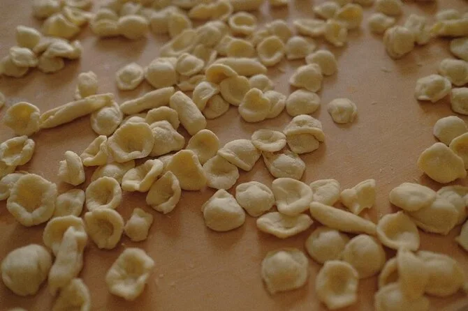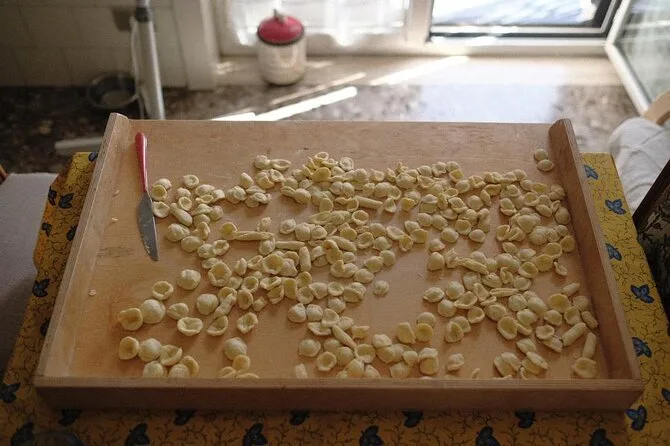 Du tauchst in eine echte Lecce-Küche ein, knetest frischen Orecchiette-Teig, lachst mit einer einheimischen Köchin bei Kaffee und Limoncello, kocht zwei klassische Soßen zusammen und genießt ein hausgemachtes Abendessen mit Weinen aus dem Salento. Mit Mehl an den Händen, neuen Freunden und Rezepten (plus eigenem Pasta-Werkzeug) nimmst du ein Stück Apulien mit nach Hause.