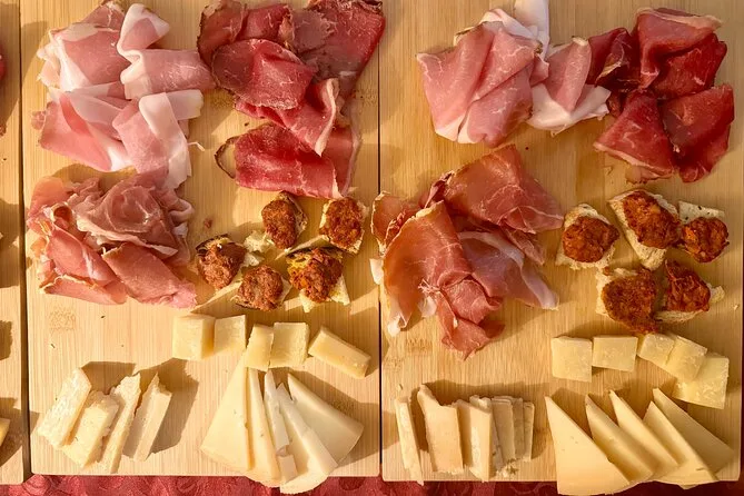 Die Verkostung umfasst Mortadella mit Pistazien, Büffelmozzarella, Ricotta, Focaccia mit Olivenöl, frisches Gemüse oder eingelegtes, Käse mit Honig oder Marmelade, Wurstwaren, Dessert (Eis oder Tiramisu) und Kaffee.