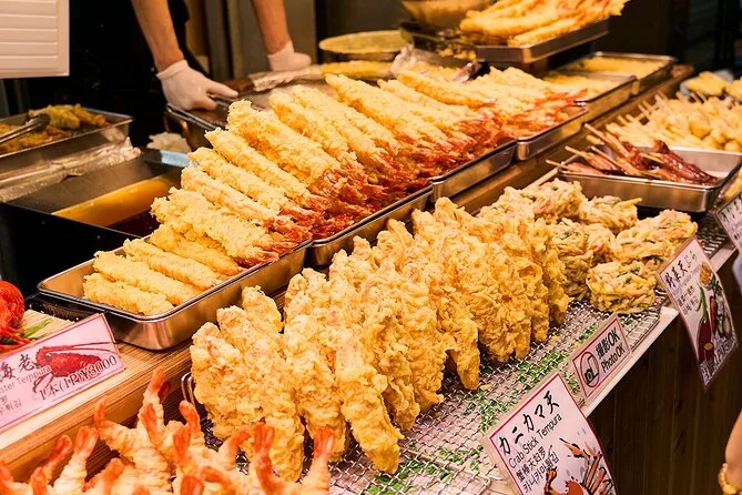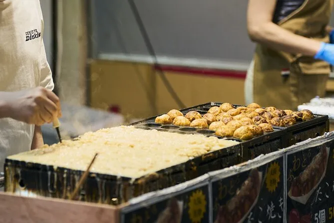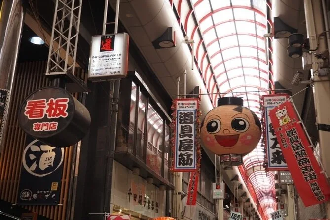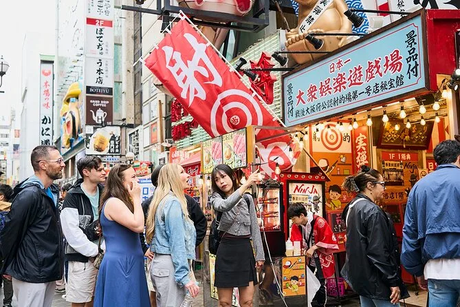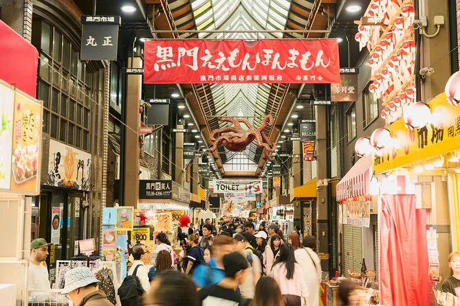 Dein Abend beinhaltet einen englischsprachigen Guide, der dich zu Osakas bekannten Street Food Hotspots führt, durch die atmosphärische Hozenji Yokocho Gasse, zu Fachgeschäften für Küchenwerkzeuge auf der Doguyasuji Straße und zum Kuromon Ichiba Markt – auch wenn abends einige Stände schließen. Alle Wege sind kinderwagen- und rollstuhlfreundlich.