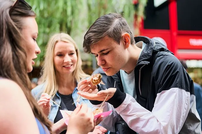Du kannst unterwegs lokale Favoriten wie Takoyaki und Gyoza probieren (besser etwas Bargeld für Snacks dabeihaben).