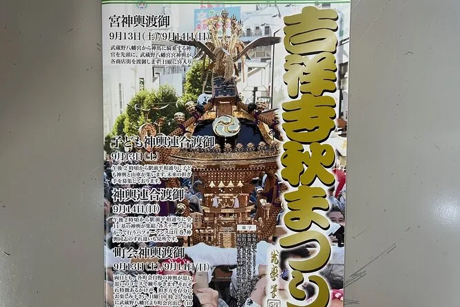 Spüre die Energie des Kichijoji Herbstfests, trage mit Einheimischen eine Mikoshi durch die lebhaften Straßen, probiere eine traditionelle Jacke an und höre echte Geschichten vom Musashino Hachimangu-Schrein. Genieße die Atmosphäre, vielleicht etwas Streetfood, tauche ein in die rufenden Menschenmengen und nimm Erinnerungen mit, die lange bleiben.