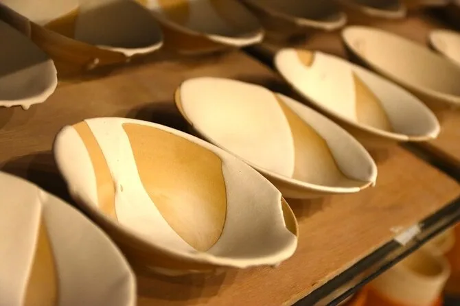 Du arbeitest mit handgefertigten Keramiken von Meister Taku, echtem japanischem Urushi-Lack und purem Goldpulver.